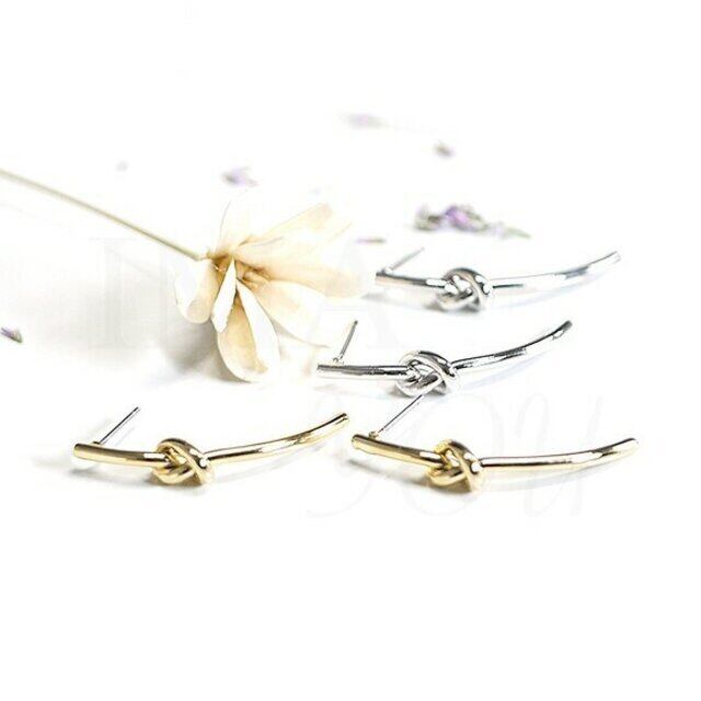 緩やかな曲線スティック上に華奢な結び目のロングで華奢なデザインの真鍮製チタン芯のニッケルフリー ピアスです。流行りやトレンドに左右されず、服装やシーンを選ばないシンプルなアクセサリーとしてオススメです。