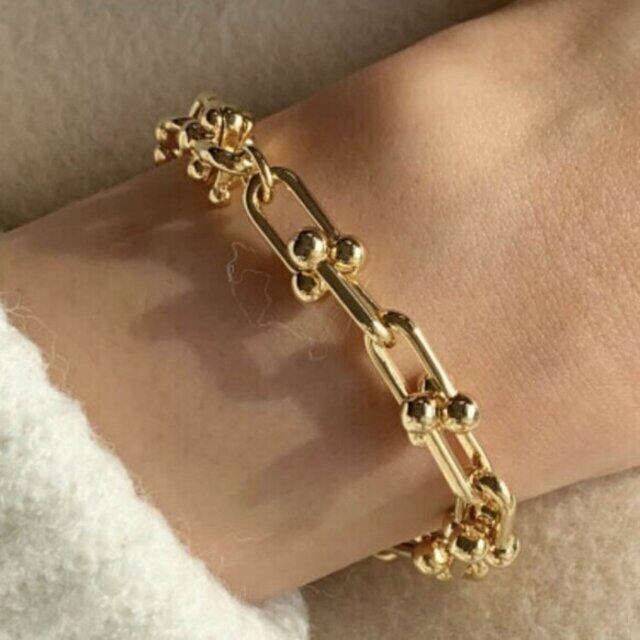 ボリューム感ある大ぶりチェーンのブレスレットです。ブレスレットの留め金具部分は取り外しが楽なマンテルを使用しております。(手首から落ちる心配はございませんのでご安心ください。)