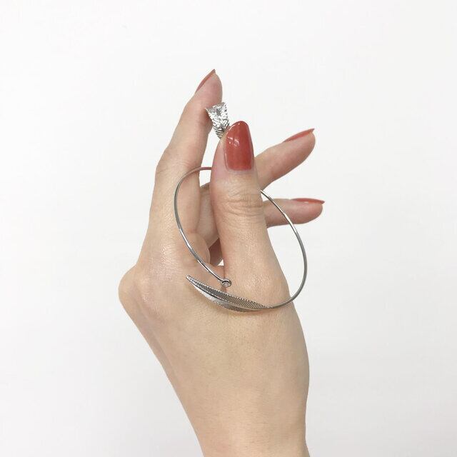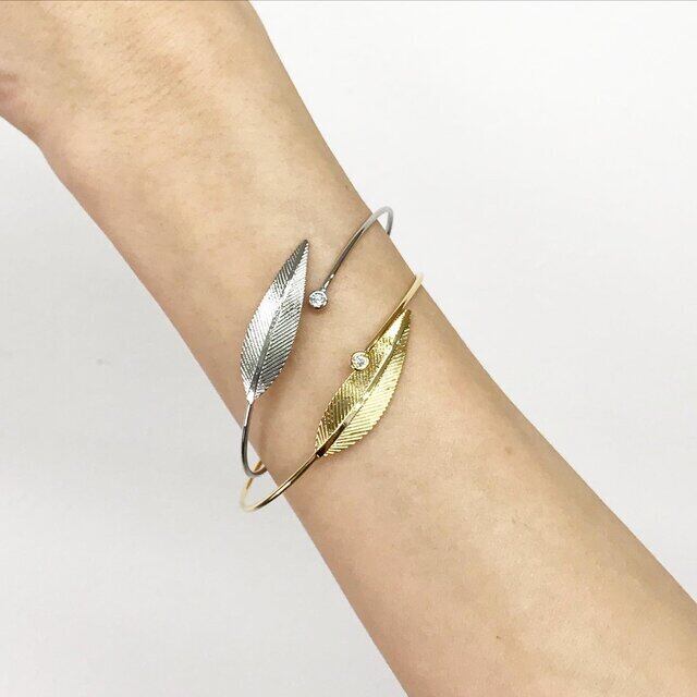 繊細なボタニカルリーフモチーフに交差する一粒キュービックジルコニアが輝くバングル、ブレスレットです。手元を包むような繊細で洗練されたモダンデザイン。お持ちのバングルと合わせてアレンジしたり、一つでも存在感を。