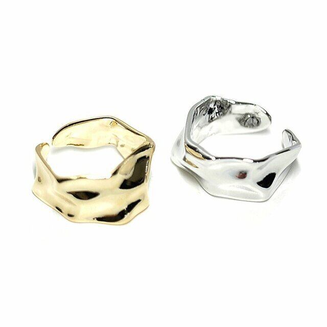 歪ませたようなニュアンス感たっぷりのヘキサゴン形デザインのフリーサイズ対応のリングです。ボリューム感、カジュアルからキレイめスタイルまで幅広いコーディネートにアクセントになります。関節リングや重ねつけリングとして着けていただけます。